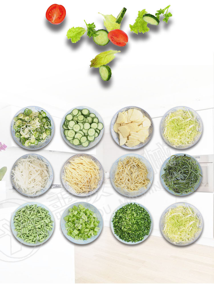 切菜机产品特点: 切菜机采用100%铜线电机,不锈钢机身,经久耐用,切丁切丝的厚度在1-10毫米内自由调整。采用竖刀以及用离心切片机头,先把物料切成片,再根据需要调节,然后切成所需规格的丝或曲线、块、丁、菱形等花样!