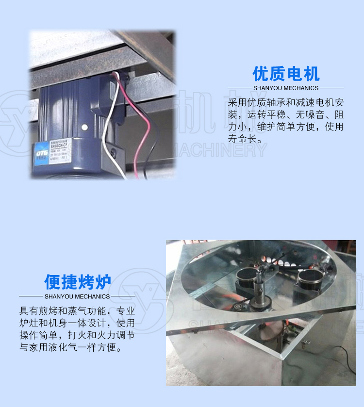 电动燃气锅巴馒头机采用液化气(煤气)加热,锅体电动转动的方式,加热温度均